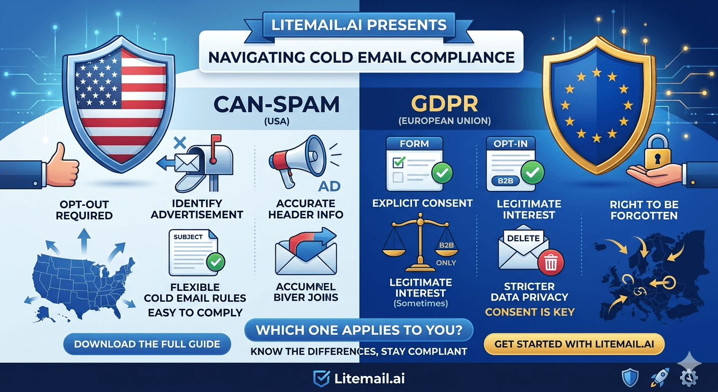 Most cold email compliance guides choose a lane: either they tell you CAN-SPAM is fine and GDPR is someone else's problem, or they overstate GDPR restrictions until the whole guide reads like cold email is illegal in Europe. Neither is accurate. Cold email is legal in both jurisdictions when done correctly — but "correctly" means different things under each law, and the differences matter if you are targeting contacts in more than one country.