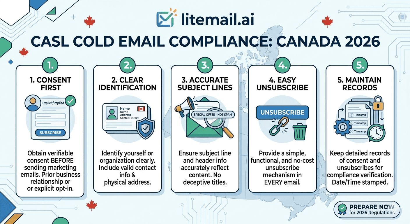 CASL applies to any commercial email sent to a Canadian recipient — including cold outreach. You need either express consent (opt-in) or a valid implied consent basis before sending. Implied consent under CASL lasts only 2 years from a business relationship or 6 months from a public inquiry. Your email must include sender ID, mailing address, and an unsubscribe mechanism that works within 10 business days. Violations can cost up to $10 million CAD per incident for corporations. The safest infrastructure choice: pre-warmed inboxes with proper authentication like Litemail, with SPF, DKIM, and DMARC pre-configured, keeping your sending reputation clean while you manage consent compliance.