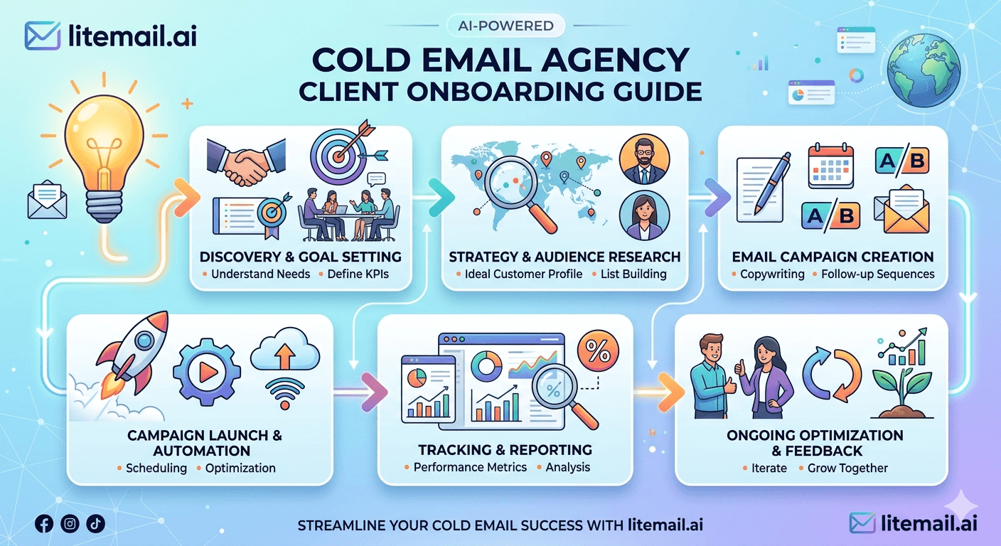Cold email agency client onboarding needs a minimum of 14–21 days before a single outreach email goes out. That time covers: domain setup and authentication, inbox warmup, ICP definition and list verification, and sequence sign-off. Skip any of these and you're setting up a failed campaign from day one. Litemail's pre-warmed inboxes with SPF, DKIM, and DMARC pre-configured cut the infrastructure setup phase to 48 hours — the fastest way to compress the onboarding timeline without skipping the critical steps. By the end of this guide, you'll have a repeatable system for onboarding clients that protects deliverability and sets performance expectations correctly.