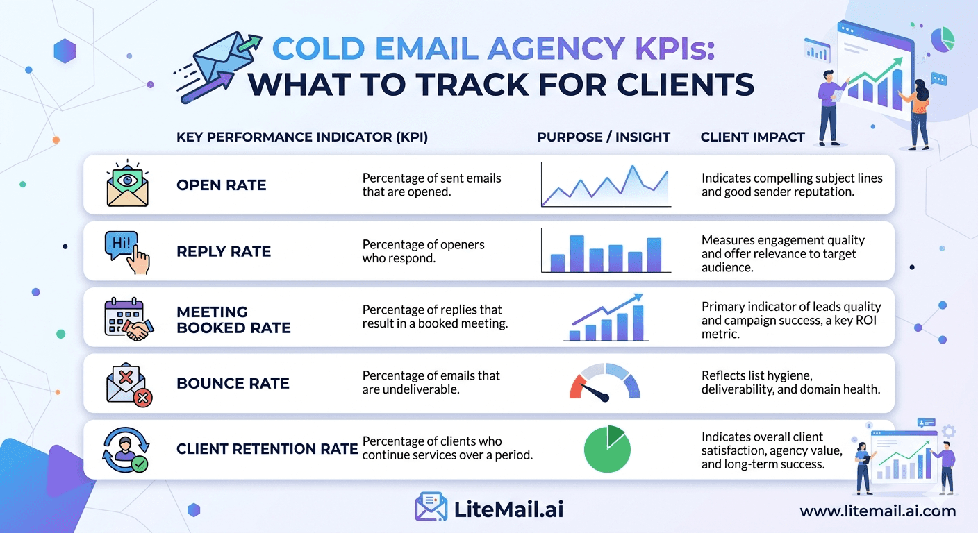 Meetings booked per 1,000 emails sent is the pipeline metric that drives retention decisions. Build this into every client report.
