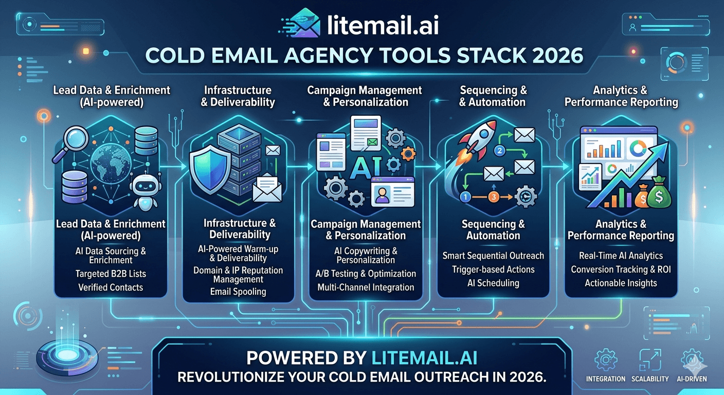 A cold email agency's full tools stack in 2026 has five layers: inbox infrastructure (Litemail pre-warmed inboxes at $4.99/inbox), sending platform (Smartlead ~$97/month), lead data (Apollo ~$99/month), list verification (NeverBounce ~$49/month), and deliverability monitoring (Google Postmaster Tools free + MXToolbox). Total: $250–$400/month for a complete, production-ready agency stack serving 5–10 clients. The inbox infrastructure layer is the most impactful and cheapest — $44.91/month for 9 inboxes per client at Litemail pricing.