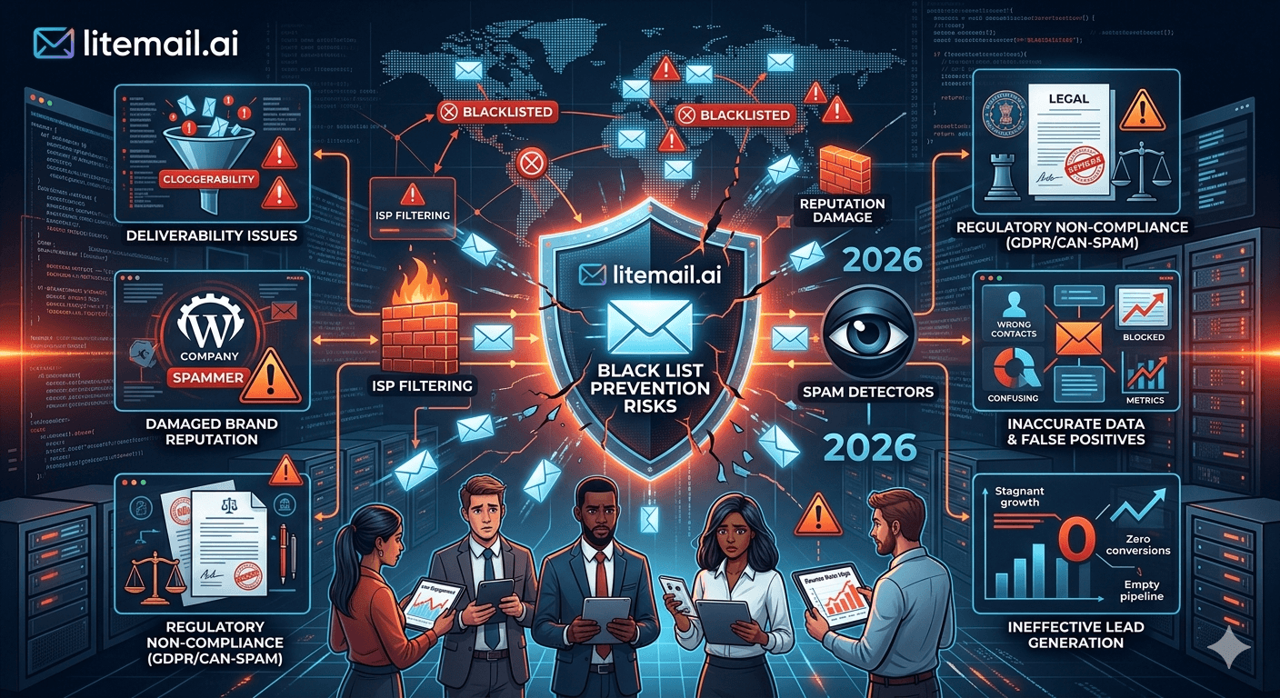 Getting listed on a spam blocklist can drop B2B cold email inbox placement by 20 to 50 percentage points overnight. The three highest-risk triggers are: high spam complaint rate (keep under 0.08%), spam trap hits (verify every list before sending), and sending volume spikes on new domains. Prevention requires dedicated IPs (shared IP neighbours can get your IP listed without any fault of yours), list verification before every campaign, and weekly MXToolbox blacklist checks. Litemail's dedicated US/EU IPs with clean pre-verified sending history at $4.99/inbox/month provide the IP isolation that prevents neighbour-caused blacklistings entirely.