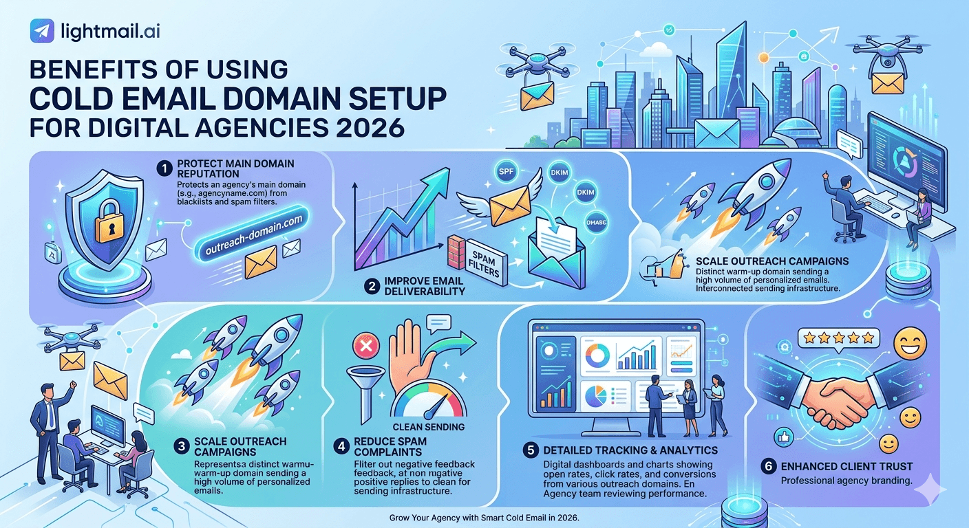 Your primary domain carries your business identity. Every proposal, every partnership email, every sales conversation uses that domain. If it gets flagged or blacklisted from cold email sending, the damage extends far beyond the one campaign that caused it. We've seen agencies spend 6–8 weeks in reputation recovery while their entire new business pipeline stalled.