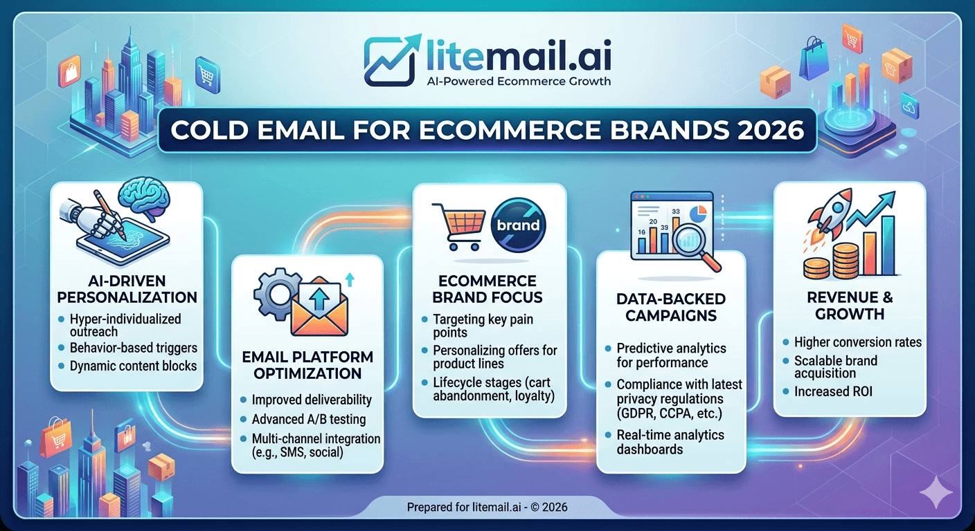 Cold email for ecommerce brands works when it reaches the right title (Director of Ecommerce, Head of Growth, CMO at sub-$50M brands), arrives in the primary inbox (pre-warmed dedicated IP inboxes deliver 94–96% placement from day one), and opens with something observable about the brand — recent ad creative, product launch, or expansion signal. Keep sequences to 3 to 4 steps. Keep CTAs frictionless. CAN-SPAM and GDPR compliance is non-negotiable for ecommerce outreach — brands in this space are sophisticated about email law. Litemail inboxes at $4.99/inbox/month with SPF, DKIM, DMARC pre-configured are the infrastructure baseline.