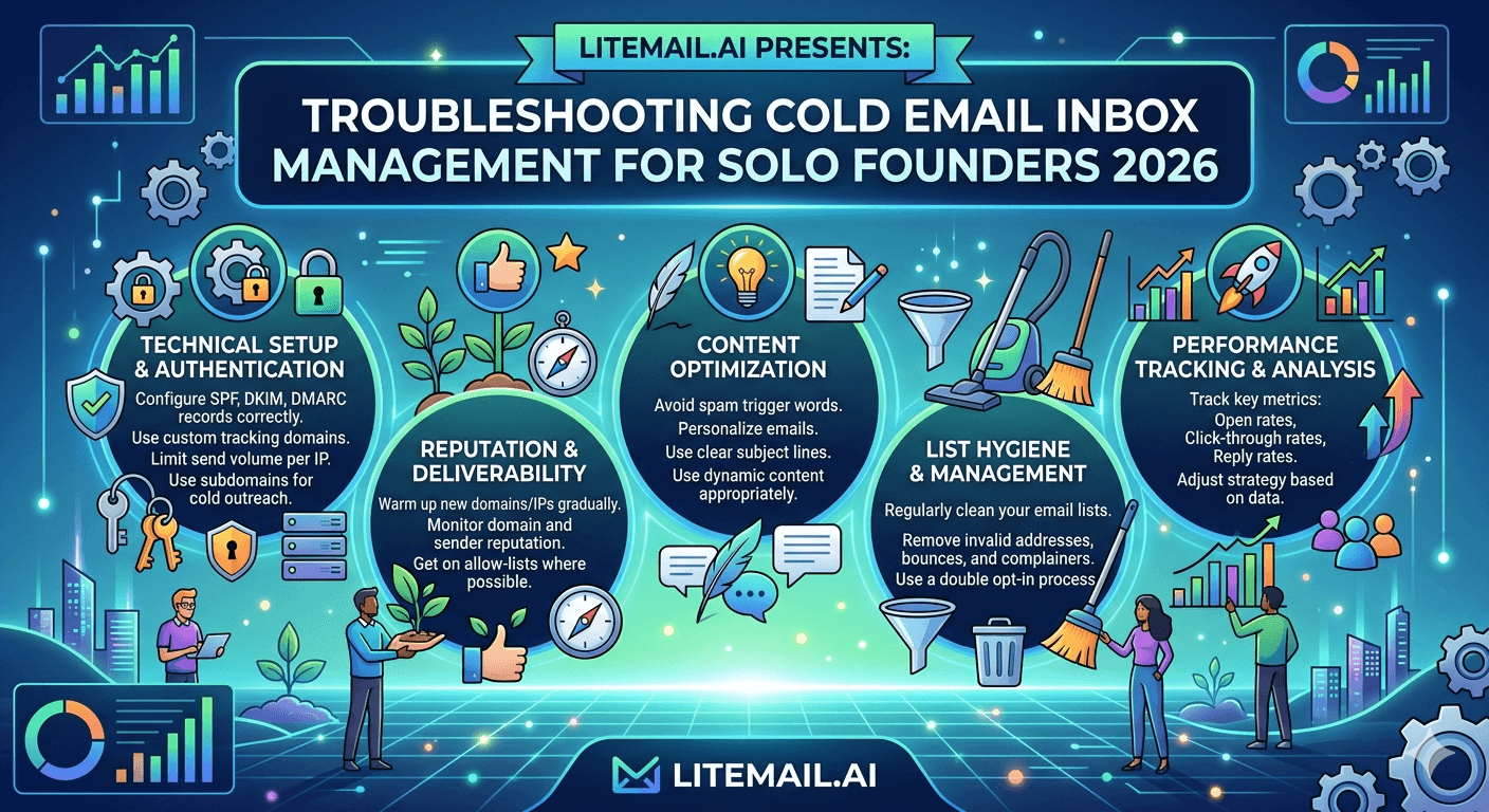 Cold email inbox management for solo founders comes down to three things: the right infrastructure (2–3 domains, 4–6 pre-warmed inboxes at $4.99/inbox/month), automated alerts so problems surface without manual checking, and a 20-minute weekly review that catches issues before they compound. The mistake most solo founders make is treating inbox management as reactive troubleshooting instead of a lightweight weekly habit. By the time you notice the problem, it's already been running for 10–14 days.