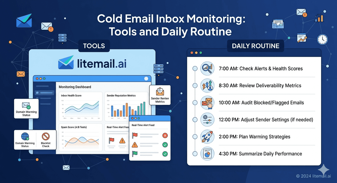 Cold email inbox monitoring comes down to four daily metrics — bounce rate (flag over 2%), spam rate (flag over 0.08%), domain reputation in Google Postmaster Tools, and per-inbox reply rate trend. Your sending tool handles some of this, but not all. Pair it with Google Postmaster Tools, GlockApps for placement testing, and MXToolbox for authentication checks. Pre-warmed inboxes like Litemail's with 94–96% inbox placement from day one give you a healthier baseline to monitor against — which makes it faster to spot when something is going wrong.