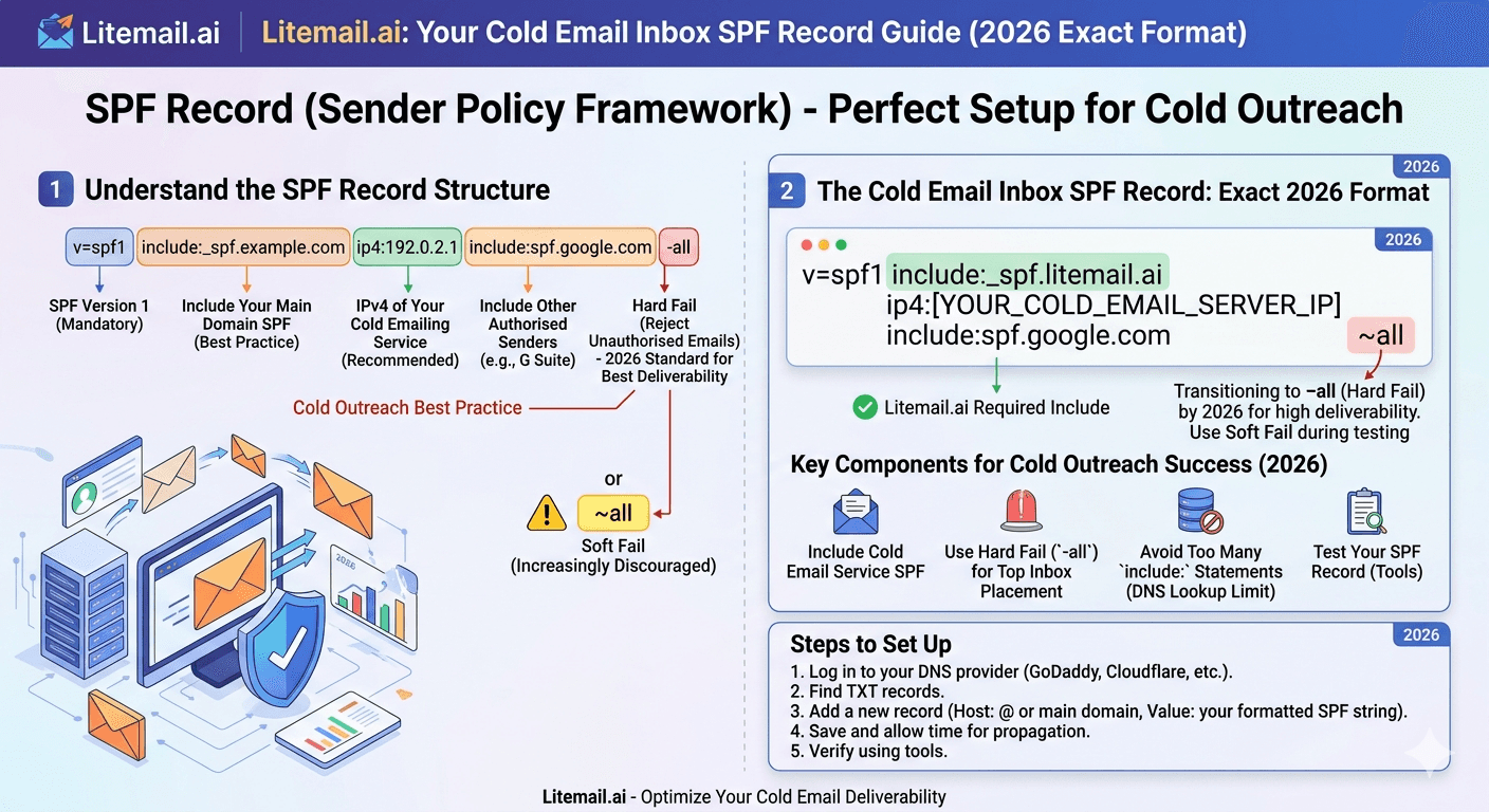 Google Workspace SPF: v=spf1 include:_spf.google.com ~all. Microsoft 365 SPF: v=spf1 include:spf.protection.outlook.com ~all. Only one SPF record per domain — multiple records cancel each other. Add at the root domain (@) as a TXT record. Use ~all (soft fail) initially, switch to -all (hard fail) after 30 days of clean sending. Verify at MXToolbox before launching any campaign — a 10-minute check that prevents weeks of diagnosing phantom deliverability problems. Litemail pre-configures SPF on every inbox at $4.99/inbox/month, eliminating per-domain manual setup and DNS propagation delays entirely.