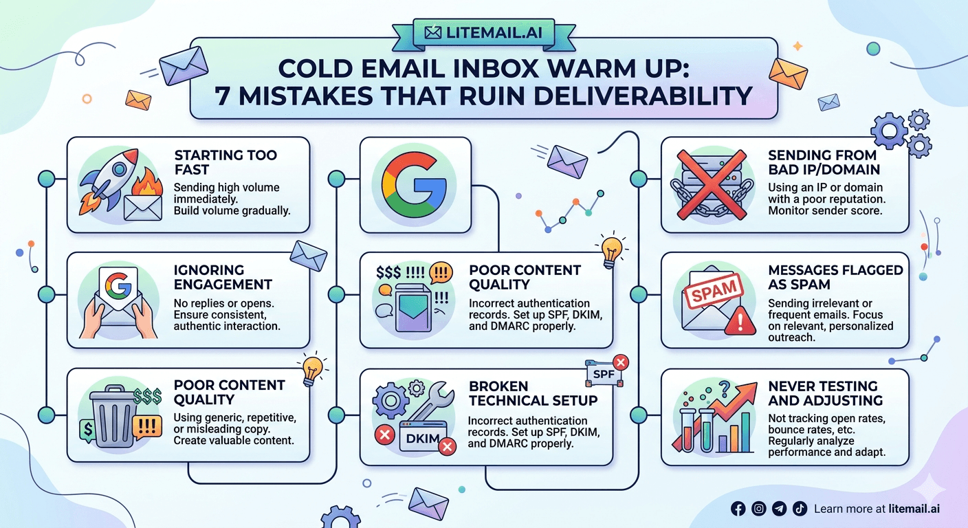 The 7 warm up mistakes that ruin cold email deliverability: wrong IP type (warming up on a shared IP), skipping DKIM and DMARC, jumping to full volume too fast, using a low-quality warm up network, sending spammy content during warm up, ignoring Postmaster signals during the warm up period, and warming up the inbox but not the domain. Fixing these adds up to the difference between 40% and 94% inbox placement. Or skip them entirely with Litemail pre-warmed inboxes at $4.99/inbox/month — Postmaster-verified reputation within 48 hours on dedicated US/EU IPs, SPF/DKIM/DMARC pre-configured.