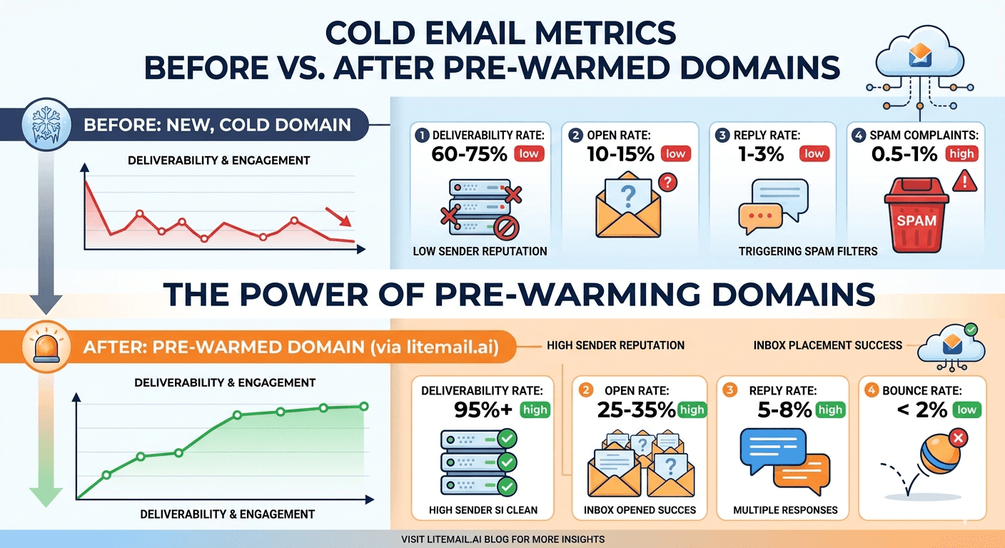 Across five B2B cold email teams that switched to pre-warmed inboxes on dedicated IPs, average inbox placement improved from 67% to 94%, average reply rate increased from 1.1% to 3.4%, and average spam complaint rate dropped from 0.09% to 0.03%. The infrastructure cost change: Litemail at $4.99/inbox/month with pre-configured SPF/DKIM/DMARC and Postmaster-verified reputation within 48 hours replaced setups costing $7 to $12/inbox/month. Lower cost, significantly better performance. The switch-to-first-result timeline averaged 4 days — no ramp period required.