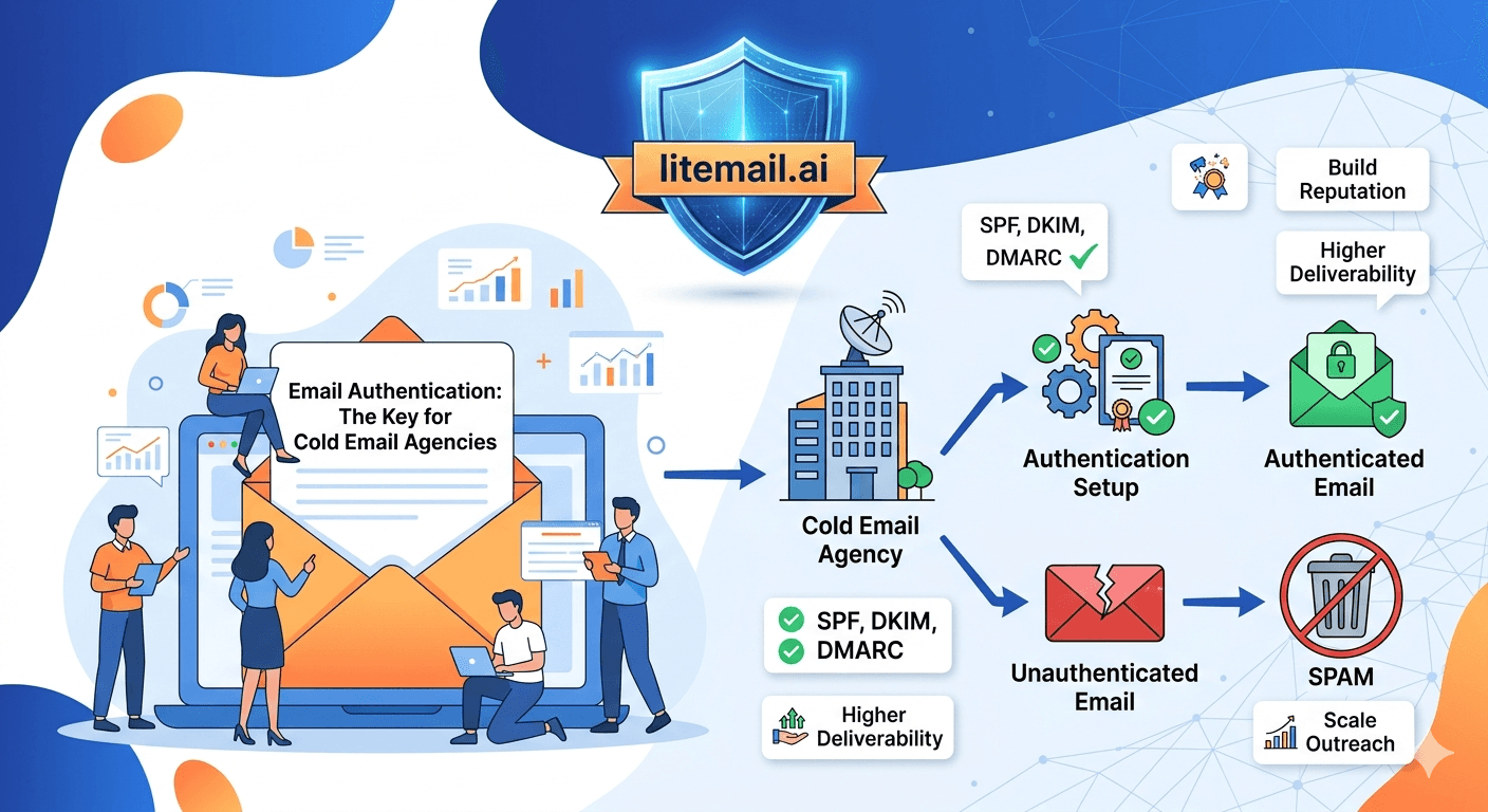 Email authentication for cold email agencies means SPF, DKIM, and DMARC configured correctly on every client sending domain — before the first email goes out. At agency scale (20+ clients, 3+ domains each), this is 60 to 150+ DNS configurations to manage and verify. Litemail pre-configures SPF, DKIM, and DMARC on every inbox at $4.99/inbox/month — eliminating the per-domain manual setup and DNS propagation wait entirely. For agencies managing their own DNS, a repeatable verification checklist and a centralized monitoring dashboard are not optional — they are the difference between a scalable operation and a permanent firefighting loop.