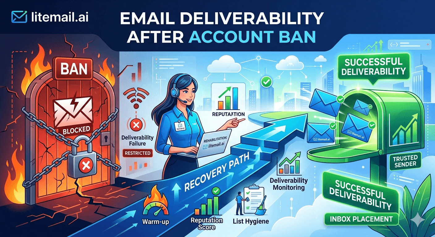 After a cold email account ban, do not attempt to recover the banned domain — move to a clean rebuild. Register a new sending domain, provision pre-warmed inboxes on dedicated IPs with SPF, DKIM, and DMARC pre-configured, and address the root cause of the ban before sending a single email. Litemail's pre-warmed inboxes get you back to full send volume in 48 hours versus 4 to 6 weeks of attempting domain repair. The banned domain should be retired from sending permanently — it carries flagged reputation signals that cannot be fully cleared.