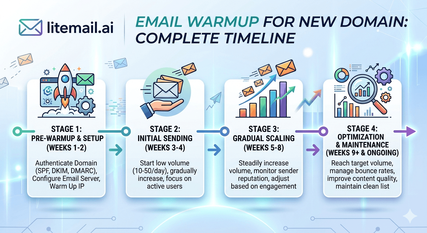 A legitimate warmup timeline is 6–8 weeks minimum. Start at 5–10 emails/day and ramp to 50/day by week 6–7. Any faster and you're outrunning the reputation-building signals.