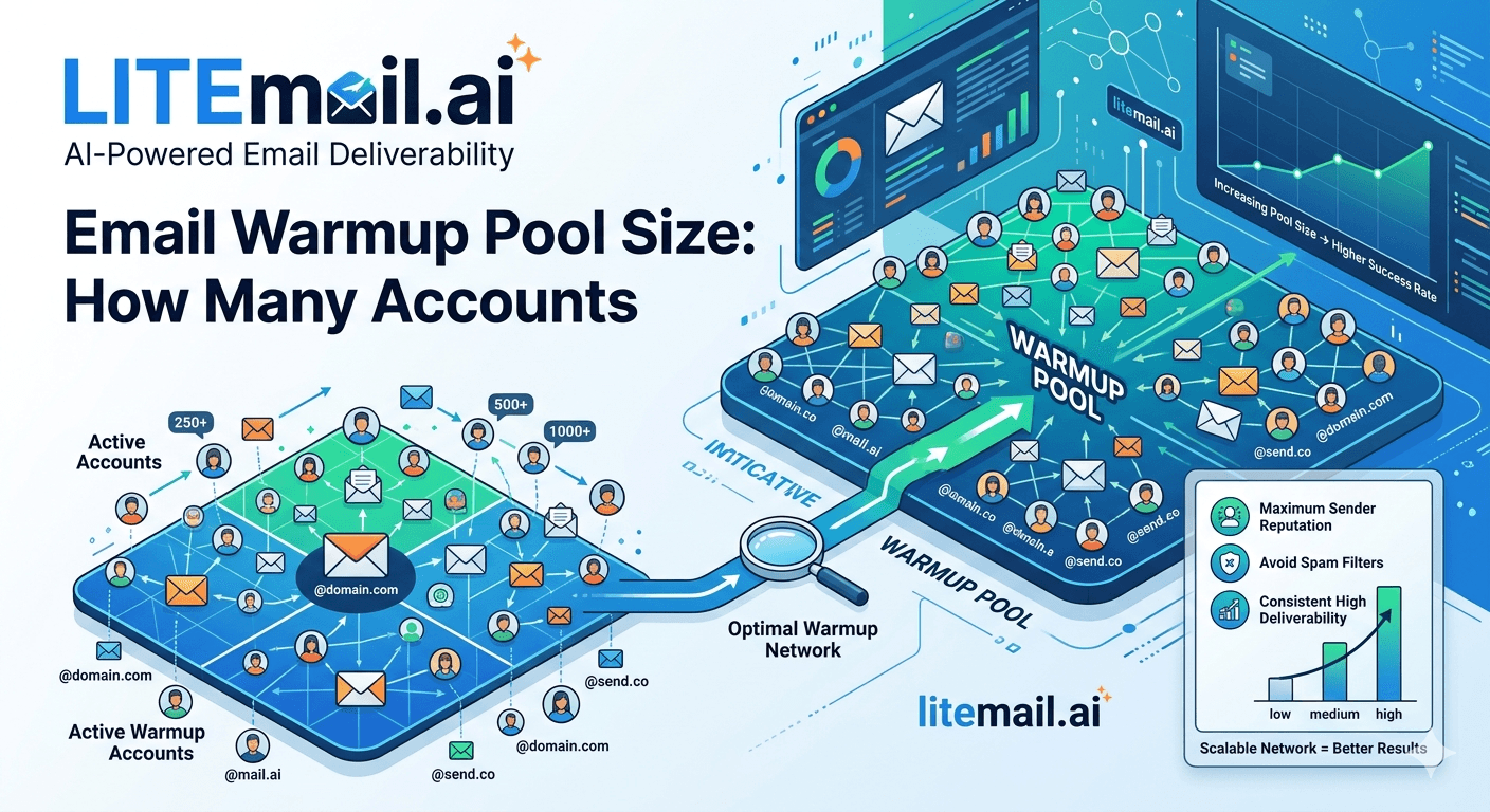 Email warmup pool size calculation: take your target daily send volume, divide by 40 (safe sends per inbox per day), and add 20% for reserve capacity. Example: 500 sends per day needs 15–17 active inboxes. A pool needs at minimum 20–30 seed accounts for quality warmup interactions — fewer than 20 gives Google insufficient engagement signal diversity. Litemail's pre-warmed inboxes at $4.99 per inbox bypass the pool calculation for getting campaigns started — inboxes arrive with Postmaster-verified reputation and 94–96% inbox placement within 48 hours. But if you're running your own warmup pool, the math below tells you exactly what size you need.