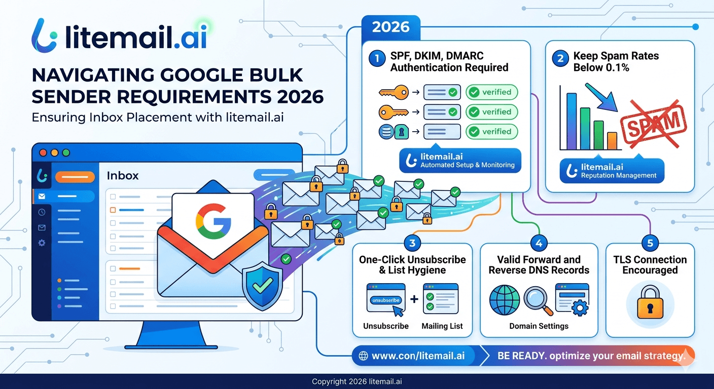 Related reading: Gmail 2026 Sender Requirements · Google Email Sender Guidelines 2026 Changes · SPF, DKIM, DMARC Auto-Setup 2026 · DMARC Not Working — Fix Guide 2026 · Google Postmaster Tools Setup for Cold Email · Litemail Pre-Warmed Inboxes — Plans and Pricing