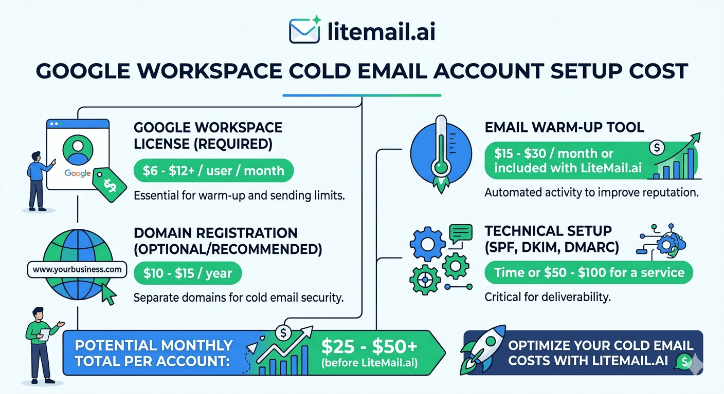 Google Workspace Business Starter is $6/user/month. For cold email, add: warmup tool ($25–$49/inbox/month for 6–8 weeks), domain ($10–$15/year per sending domain), and a cold email platform ($37–$97/month). For 5 inboxes, total first 2-month cost is approximately $584 before campaigns can launch. Litemail pre-warmed GWS inboxes at $4.99/inbox include warmup history and automated DNS — total 5-inbox stack with platform is $74.95/month from day one.