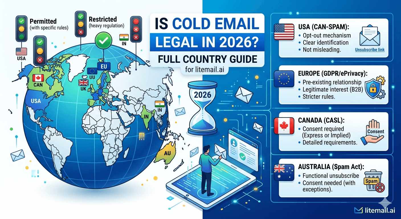 Cold email is legal in 2026 in the US, EU, UK, Canada, Australia, Brazil, India, UAE, and Singapore — with varying consent and transparency requirements across jurisdictions.