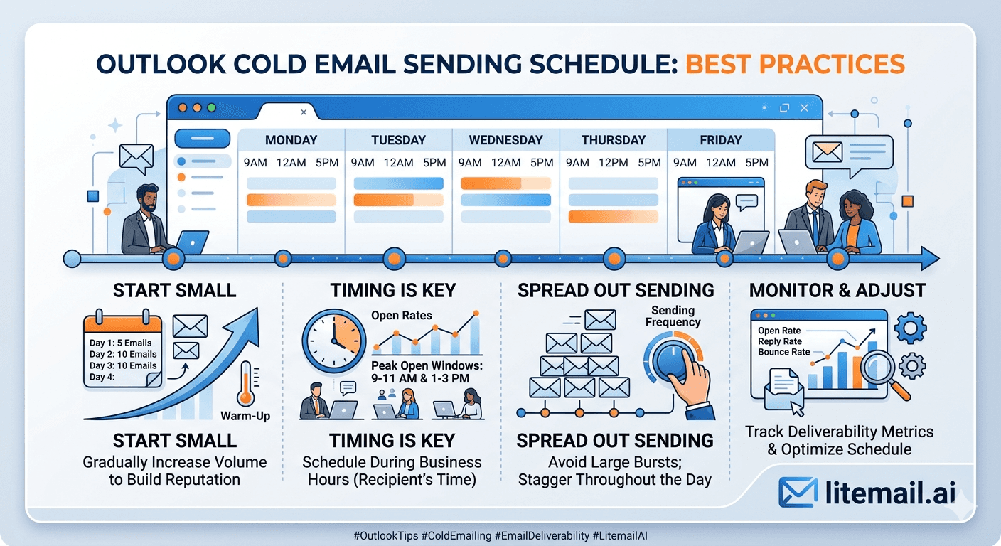 Sending schedule matters beyond just daily totals. Outlook's filters treat burst sending — 50 emails in 30 minutes — as a higher-risk pattern than the same 50 emails spread over 6 hours. Here's the schedule structure we recommend.