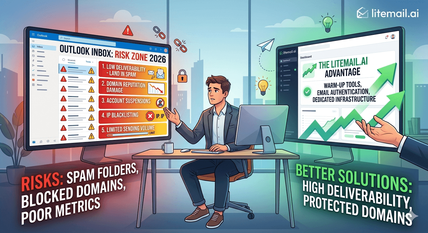 Yes — but with proper setup. The risks are real and the policy is stricter in 2026 than it was in 2025. Startups that succeed with Outlook cold email use dedicated sending domains (never the primary company domain), wait 14+ days before first send, use pre-warmed inboxes with established history, and stay well under 200 emails per day per inbox in the first 60 days. Skip any of these and suspension risk is high.